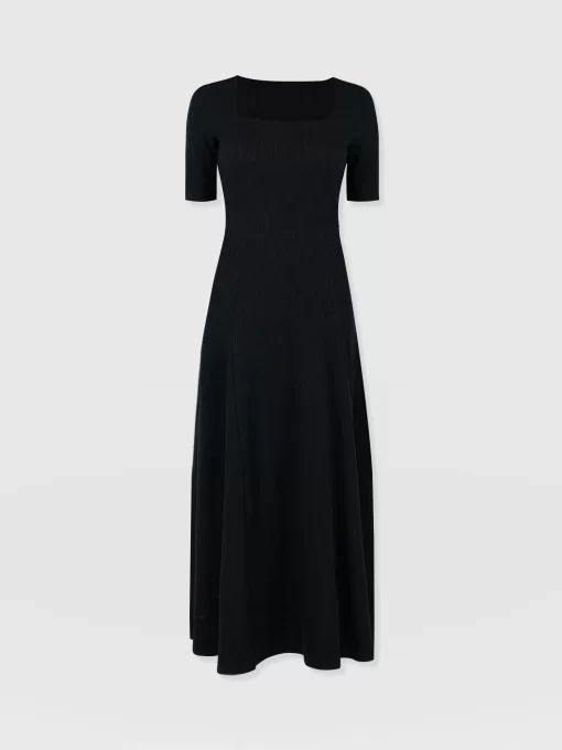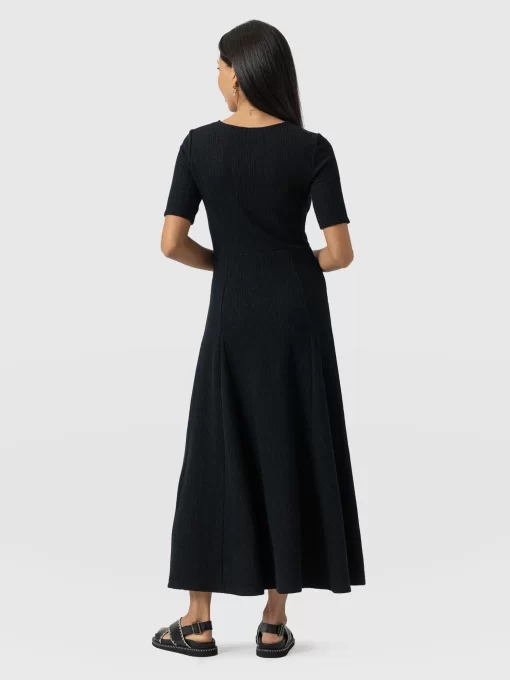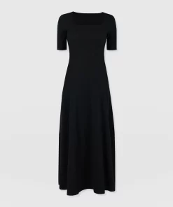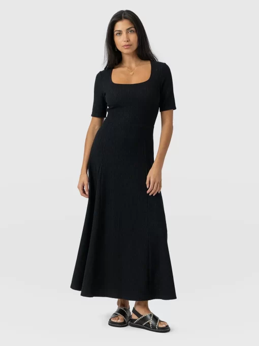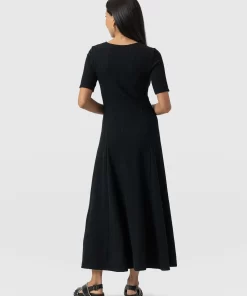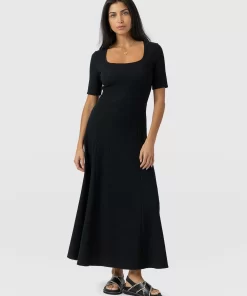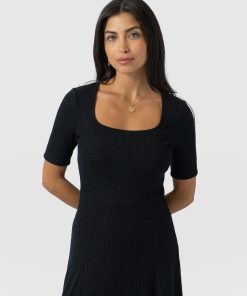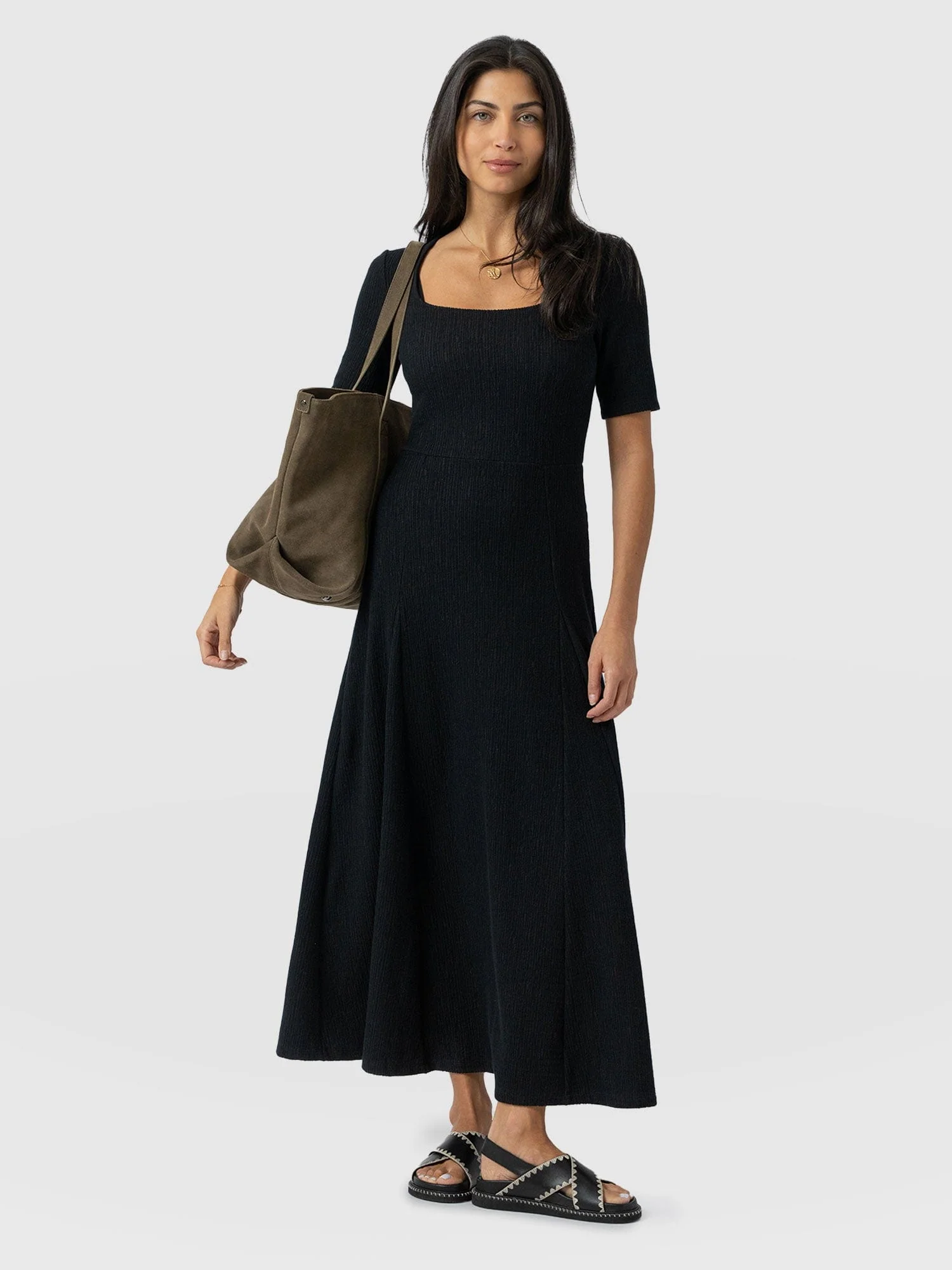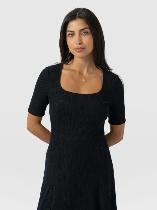 The Akia Short Sleeve Dress is a square neck design with a voluminous skirt that falls to a calf-grazing midi length. It’s handmade from stretch-infused organic cotton and features a textured bodice with short sleeves. At the waist, it flares into a breezy skirt stitched with godets for added fullness. Style yours with sandals on warmer days, or layer under a jacket when the temperature drops.