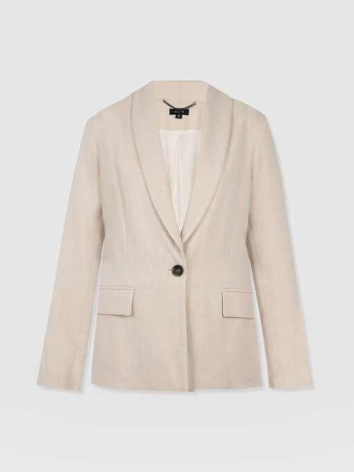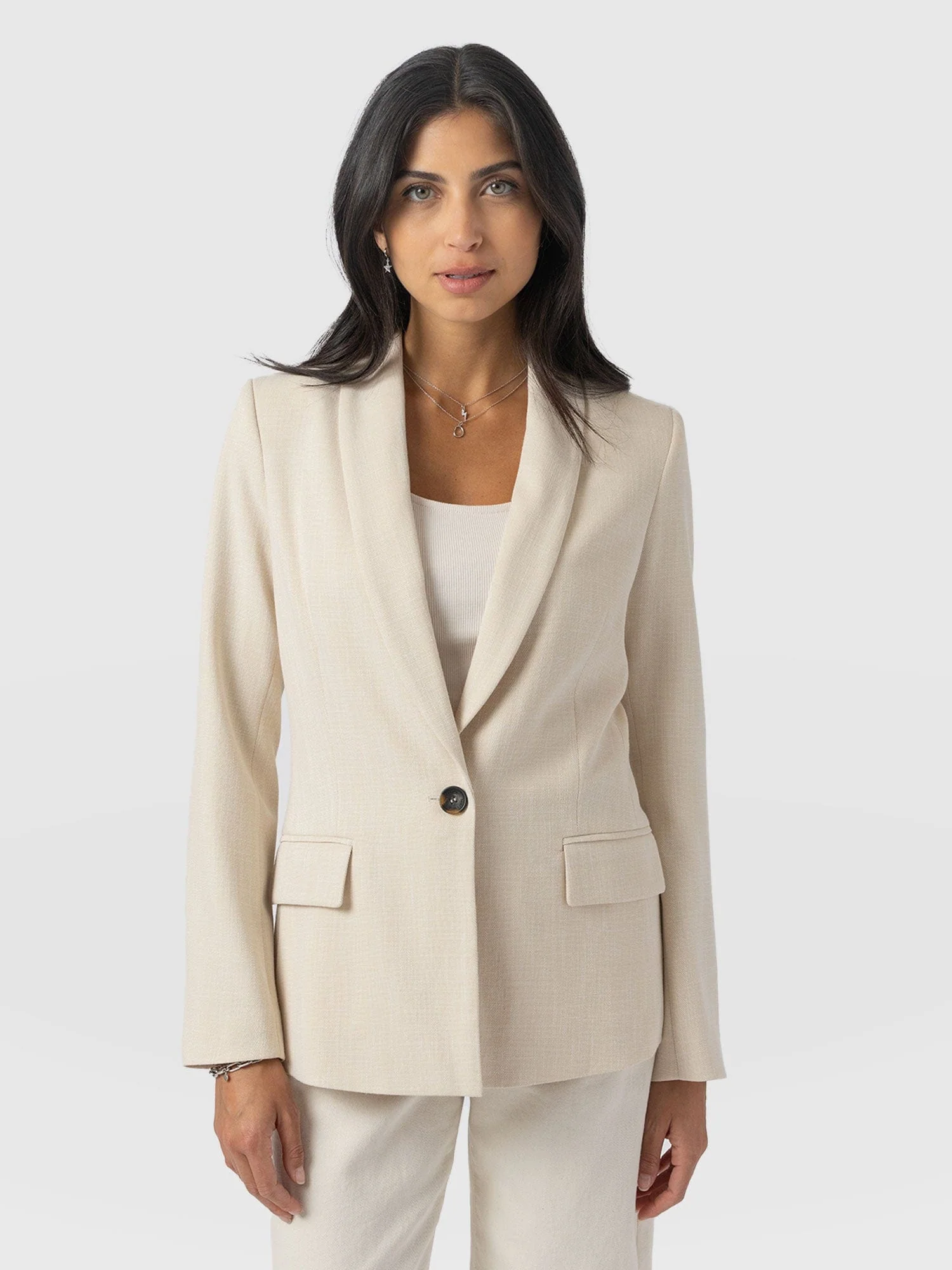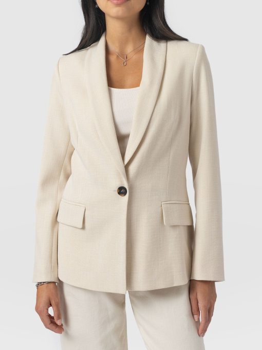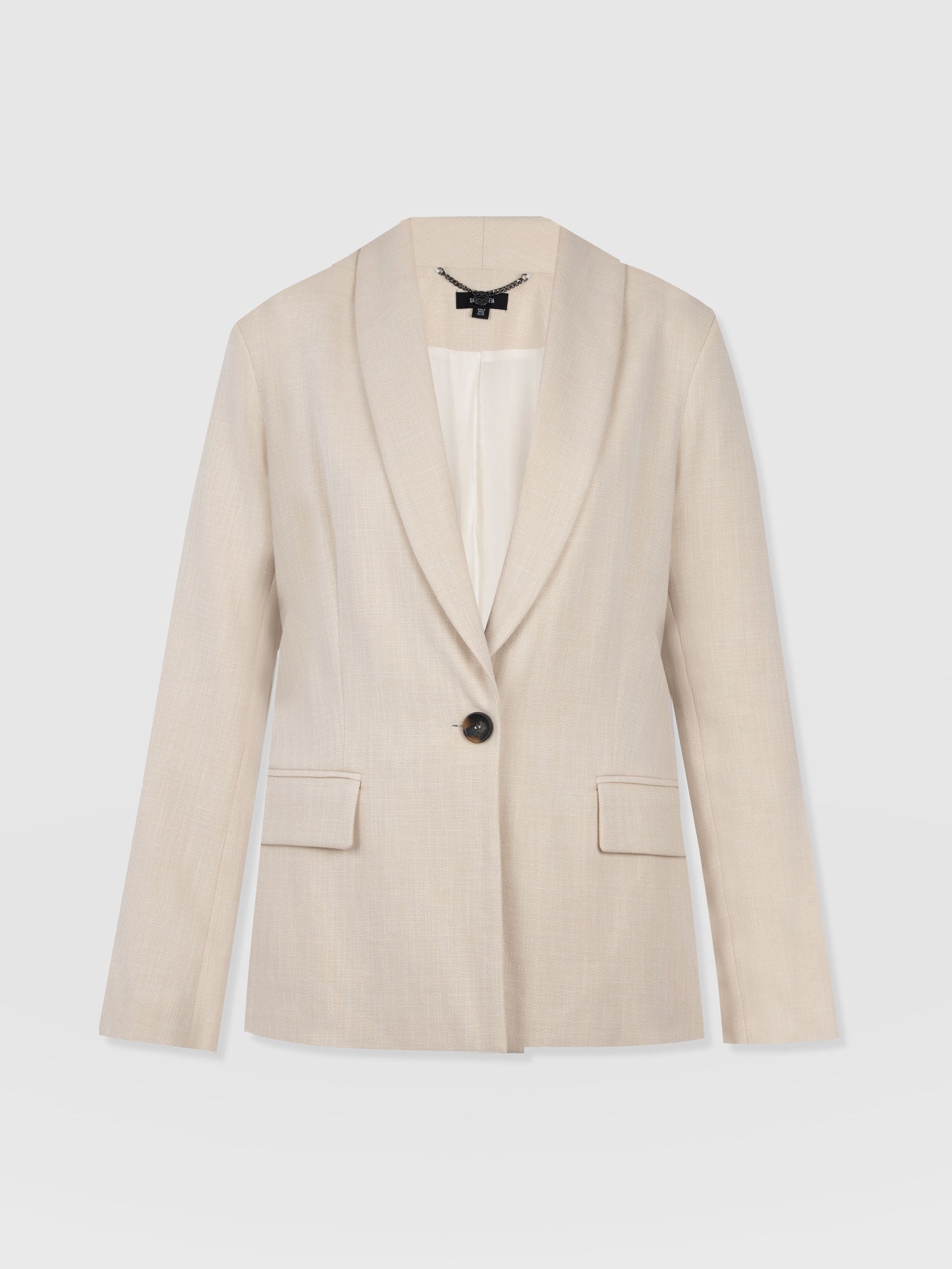 The Argent Blazer in cream is a beautifully simple single-breasted design that’s cut to a relaxed fit from a planet-friendly material and features a slender shawl collar. Slightly padded at the shoulders, it helps to accentuate your figure against the trimmed waist. Each style is masterfully tailored by hand in our studios in Europe, where artisans ensure the highest quality and a chic finish with horn buttons.