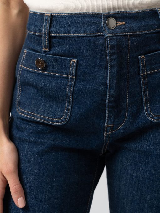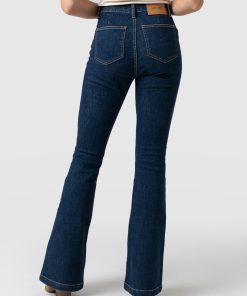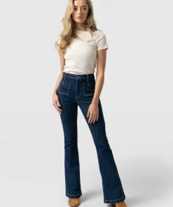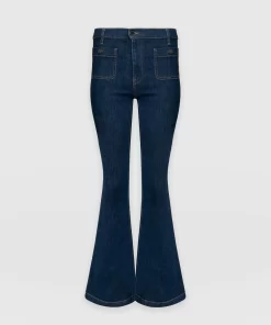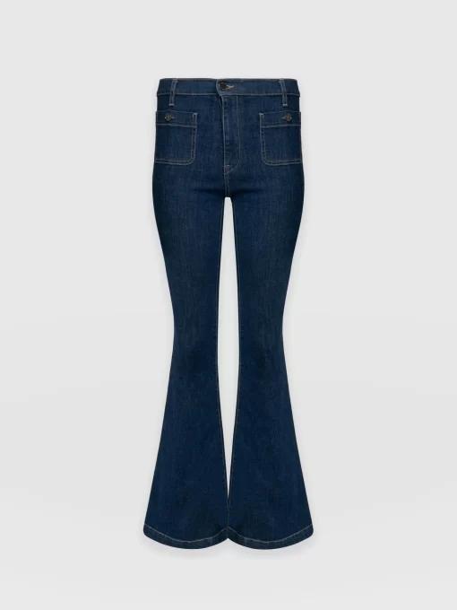 A classic flared jean in mid blue with some stretch for a stylish, vintage look. Perfect for work or weekends, these flared jeans have a flattering fit with a high waist and patch pocket detail. Each style is designed in our London studios and hand made in Europe. Wear back with our Riviera Tee, Cambridge Blazer and heels for a night out look.