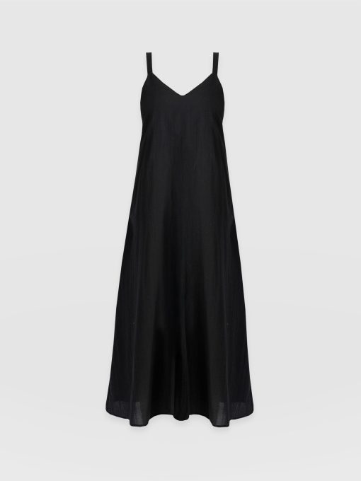 A lightweight dress perfect for when the sun starts to shine, the Candice Dress in black is a beautifully elegant design handmade from breezy cotton voile. It’s shaped to a plunging V-neckline with sleeveless straps and a full skirt that creates an A-line silhouette. Style yours with slides to hail that warmer weather.
