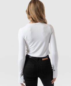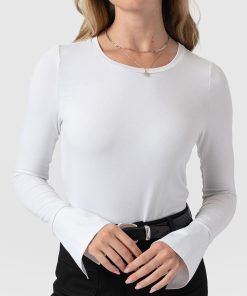 Designing with layering in mind, we created the Connie Cuff Tee in white. This long-sleeved piece is handmade from a stretch-infused jersey that skims close to your frame to allow for easy stacking. But the real star of the show? The flared cuffs with branded buttons that work to create the illusion of a shirt when worn under knitwear. Use this style to add a touch of quiet elegance to your winter layers.