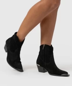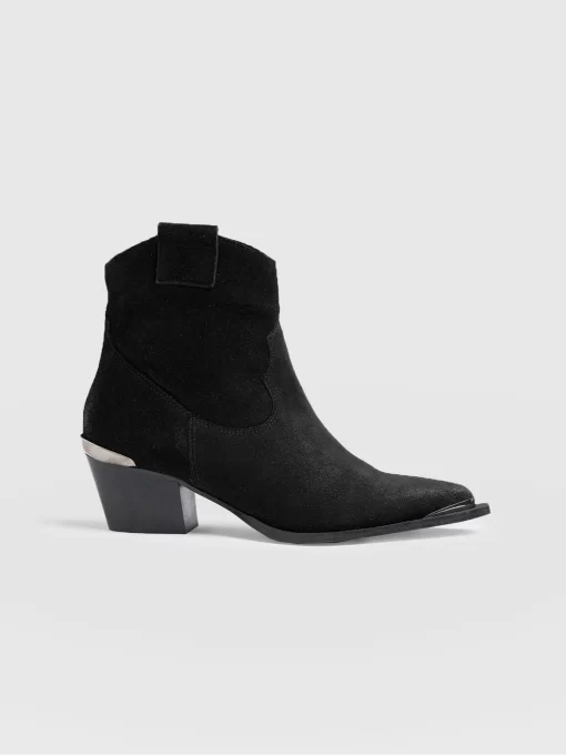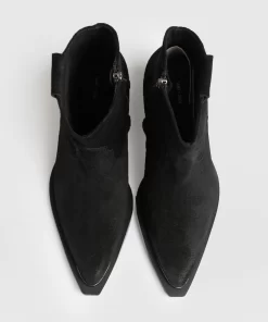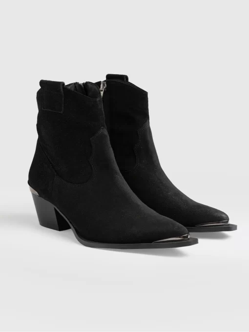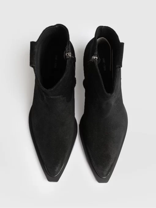 The Dallas Boot in black is a classic ankle silhouette inspired by Western style. Each pair is handmade using soft suede and finished with discrete, tonal stitching along its panelled frame. Immediately comfortable, they boast a slimline design with a pointed toe and chunky heel. Wear this playful shape to your first rodeo or your Sunday brunches with anything from dresses to skirts and jeans.