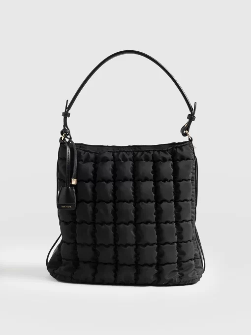 The Darcey Puff Tote Bag in black is a beautiful quilted shoulder bag that’s perfect for work days or weekends. Finished with a chic leather strap and a zipper on the back of the bag for ease of use. It features convenient internal pockets to keep your items safe and an extra internal bag for your essentials. We’ve added hot press branding and a D ring on the inside of the bag. This bag is ideal for daily wear while you’re on the go. Limited number available.