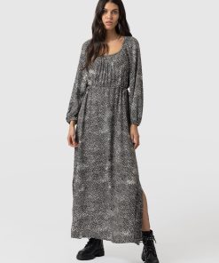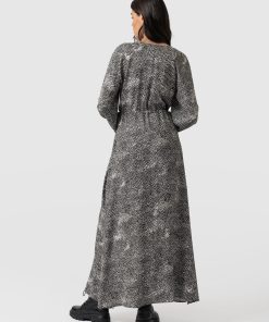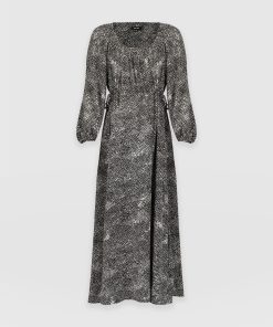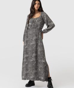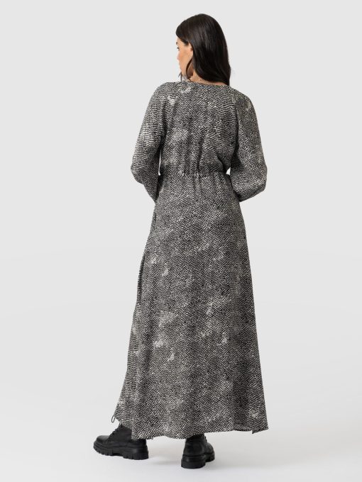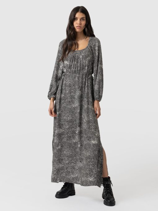 An elegant, scoop neck midaxi dress. The Henrietta Dress is a versatile and chic addition to your wardrobe in our unique monochrome gothica print. This dress offers two different styling options: wear it as a stunning scoop neck, with a sophisticated ruched neckline, or elegantly off the shoulder. The adjustable drawcord waist creates a flattering and fashionable look. For a casual vibe, pair it with our sneakers or boots and a cross-body bag. To elevate your ensemble for a wedding or special occasion, style it with our Odette Block Heel Slingback and Cambridge Blazer.