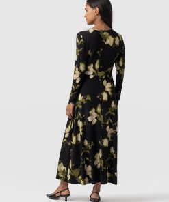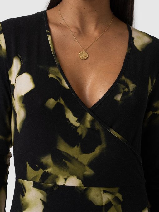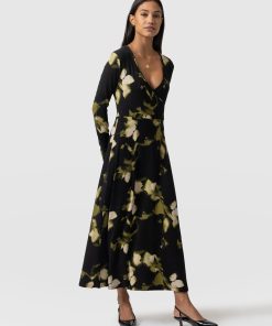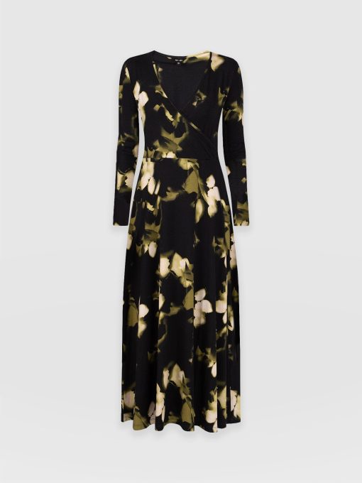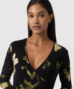 The Maggie Wrap Dress is a beautiful midi cloaked in our floral Green Aurora print and handmade using a soft and sustainable eco-viscose. This chic style features a skin-baring V-neckline mock wrap and a full A-line skirt. Thanks to its long sleeves, it’s perfect for styling all year round; slip yours on in the summer with sneakers and in the winter with a jacket, tights, and boots.