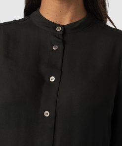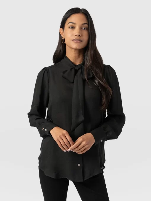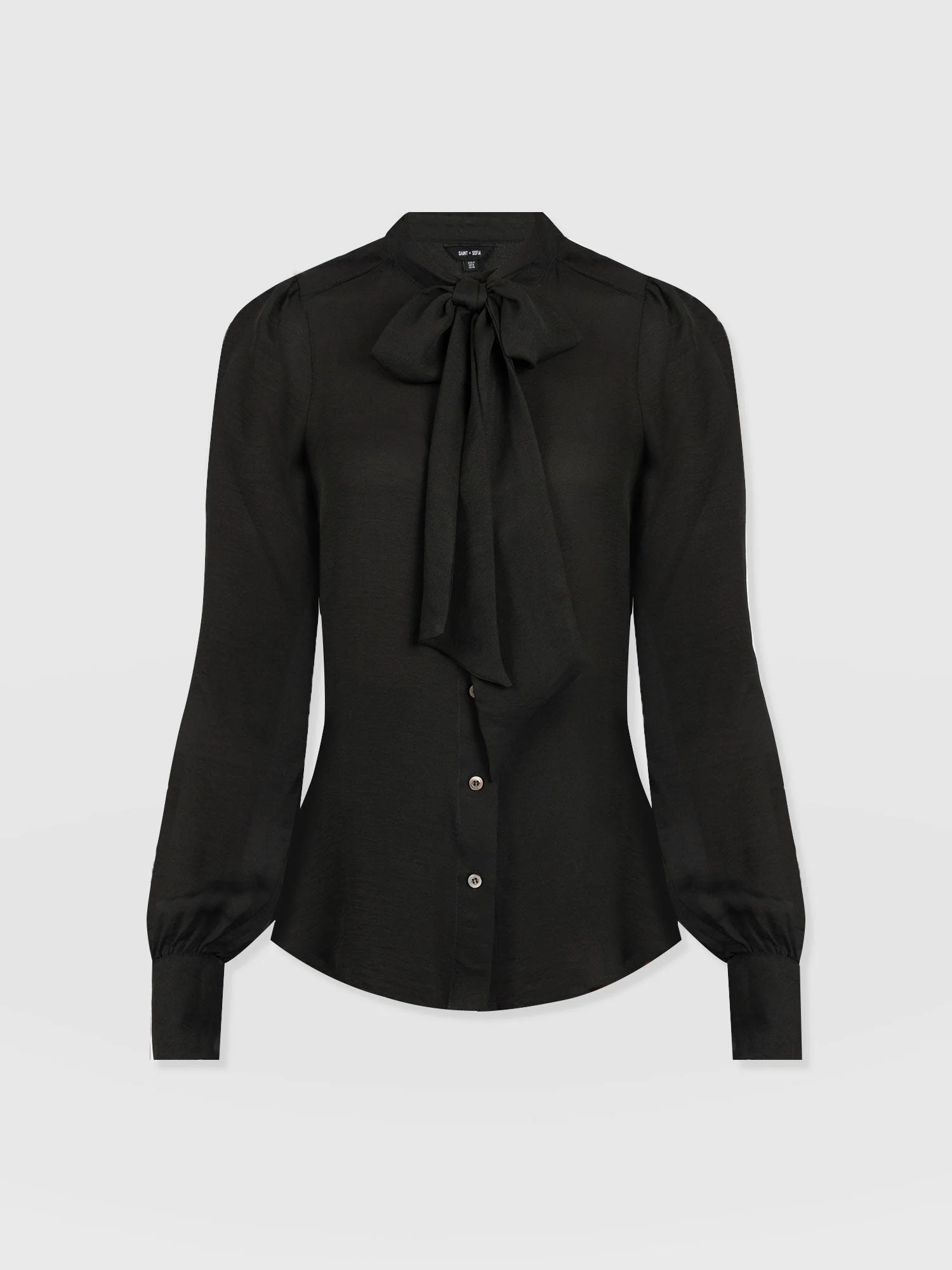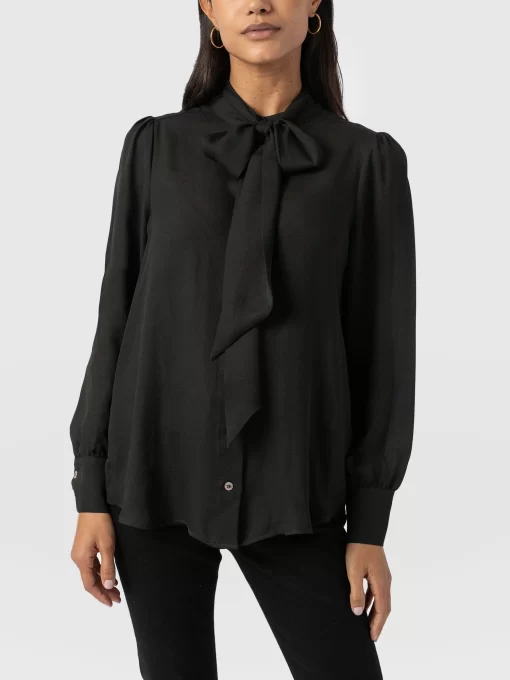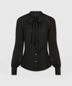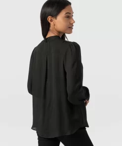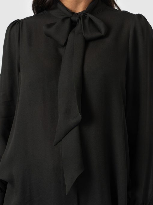 Meet the Paxton Blouse: an elegant button-up handmade from a semi-sheer georgette fabric and fitted with a detachable pussybow at the neckline for versatile styling. The delicate layer is trimmed with subtle raglan sleeves and faux mother-of-pearl buttons at the cuffs for a beautifully chic finish. Style yours with a pair of the Maeva Skinny Pants or our leather shorts and tights.