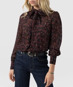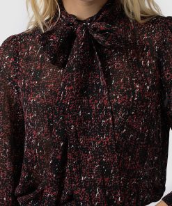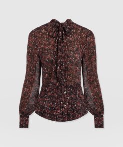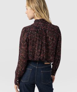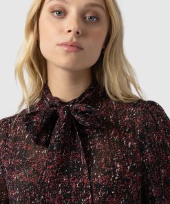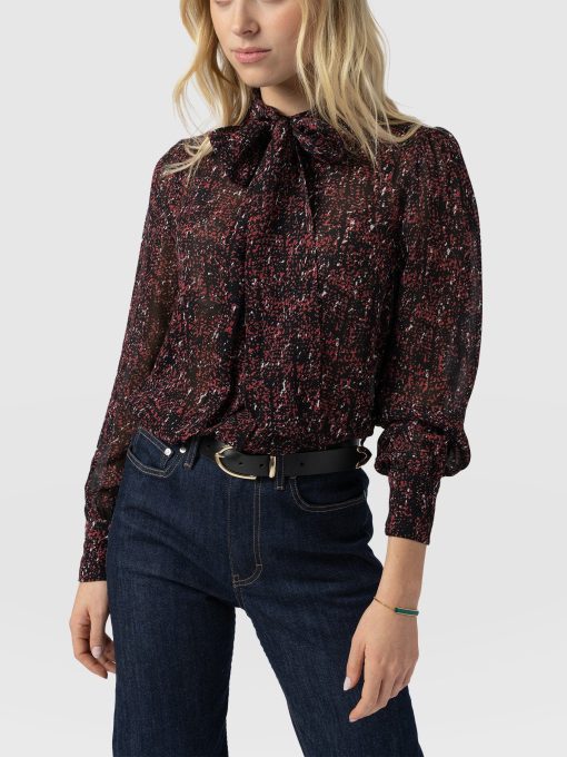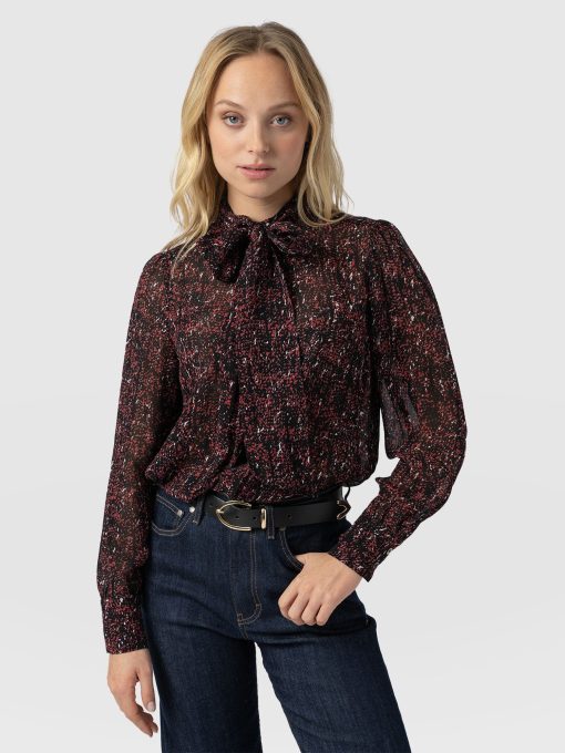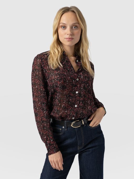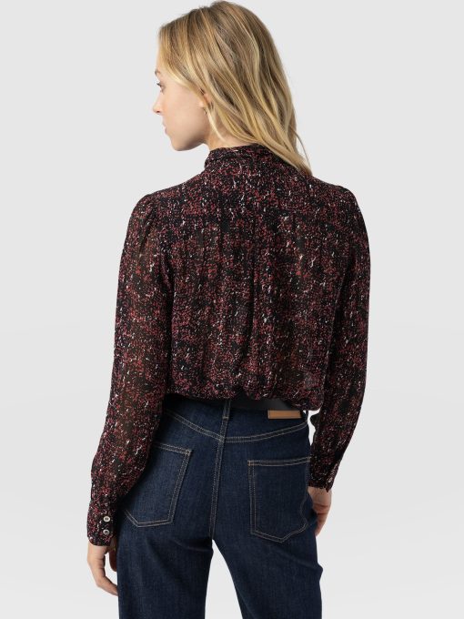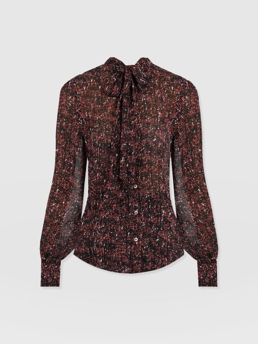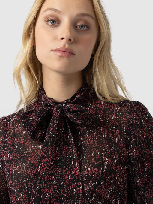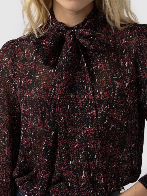 Meet the Paxton Blouse in Red Ditsy Leopard: an elegant button-up handmade from a semi-sheer georgette fabric and fitted with a detachable pussybow at the neckline for versatile styling. The delicate layer is trimmed with subtle raglan sleeves and faux mother-of-pearl buttons at the cuffs for a beautifully chic finish. Style yours with a pair of the Maeva Skinny Pants or our leather shorts and tights.