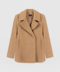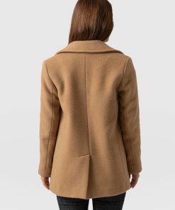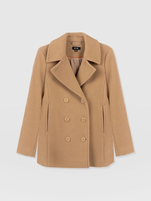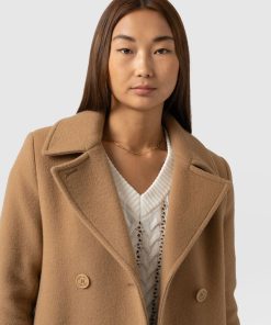A classic, timeless statement pea coat in Camel. This semi-fitted coat is elegantly designed to hip length and embraces a flattering silhouette that complements any outfit. Its long sleeves and back vent provide both comfort and mobility without sacrificing elegance. Fully lined with a back neck chain and contrast red internal binding. for luxury from the inside out. Featuring six branded buttons and two internal jigger buttons, this coat boasts refined detailing that elevates its charm. Embrace the allure and versatility of the Quinn Pea Coat, a true wardrobe essential for the cooler months.