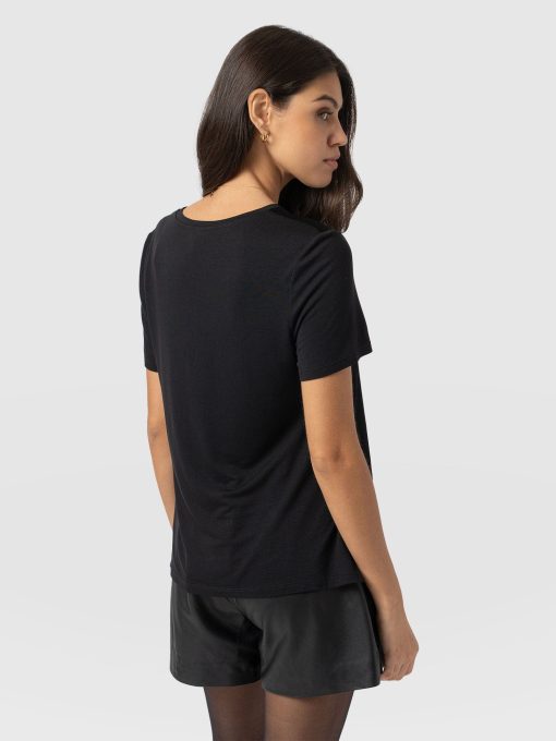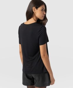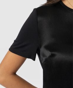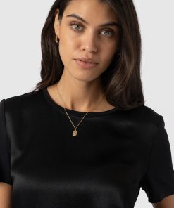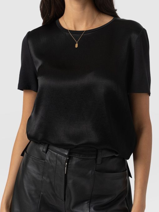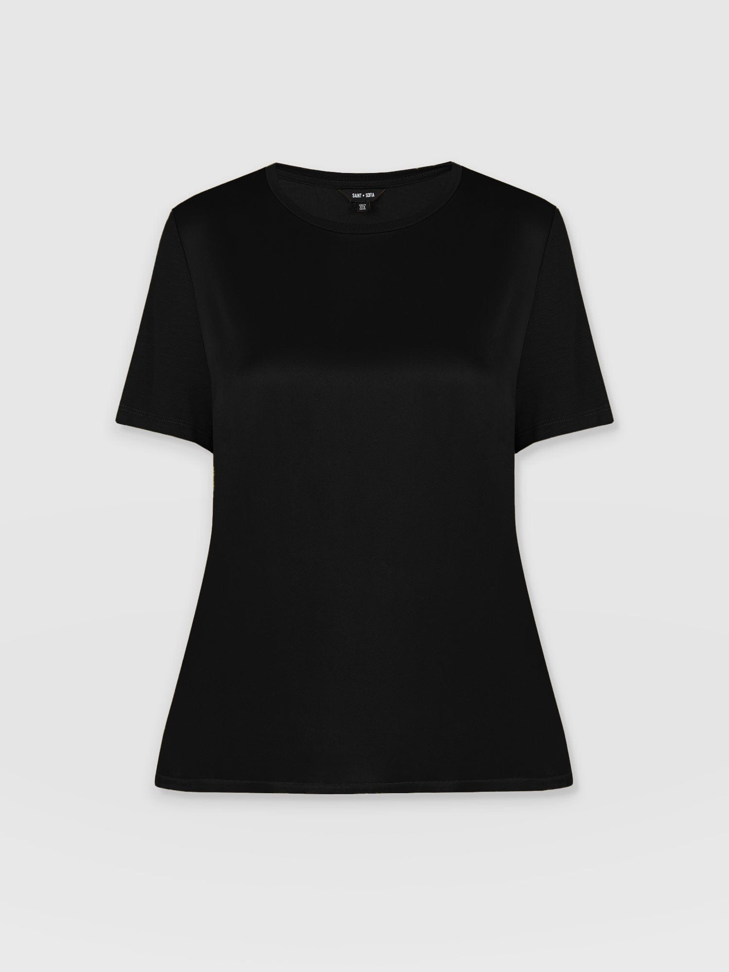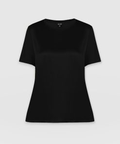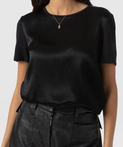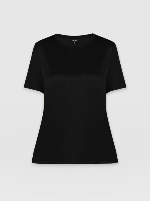 The Rayner Contrast Tee in black uses a beautiful blend of textures to elevate your classic crew neck tee. Handmade by artisans in Europe, this timeless design features a glossy satin front panel with a soft and smooth jersey decorating the sleeves and back panel. It’s cut to a relaxed fit for easy wear and looks chic when styled with the Bowie Jeans and your favourite sneakers.