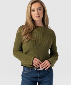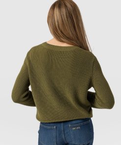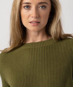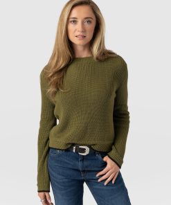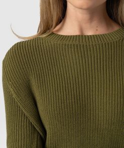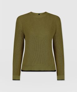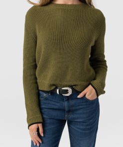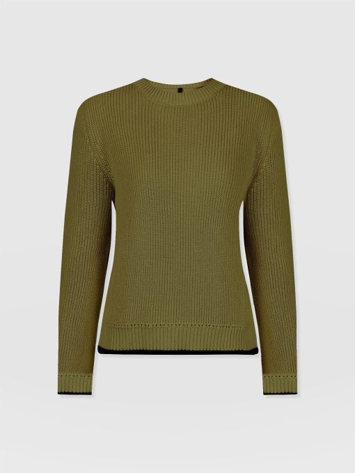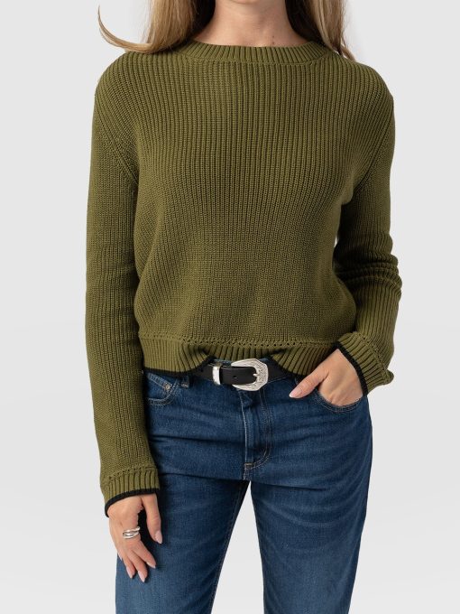 A transitional knit designed for the changing seasons, the Remy Crop Sweater in khaki boasts a chunky rib stitch to keep you warm when the weather shifts to cooler temperatures. Its regular-fitting silhouette and crew neckline are handmade using soft and smooth organic cotton and trimmed with contrasting tipping along the cuff and hem for an elegant finish. Dress down with high-waisted jeans and sneakers, or style up with the Bonham Leather Shorts and boots.